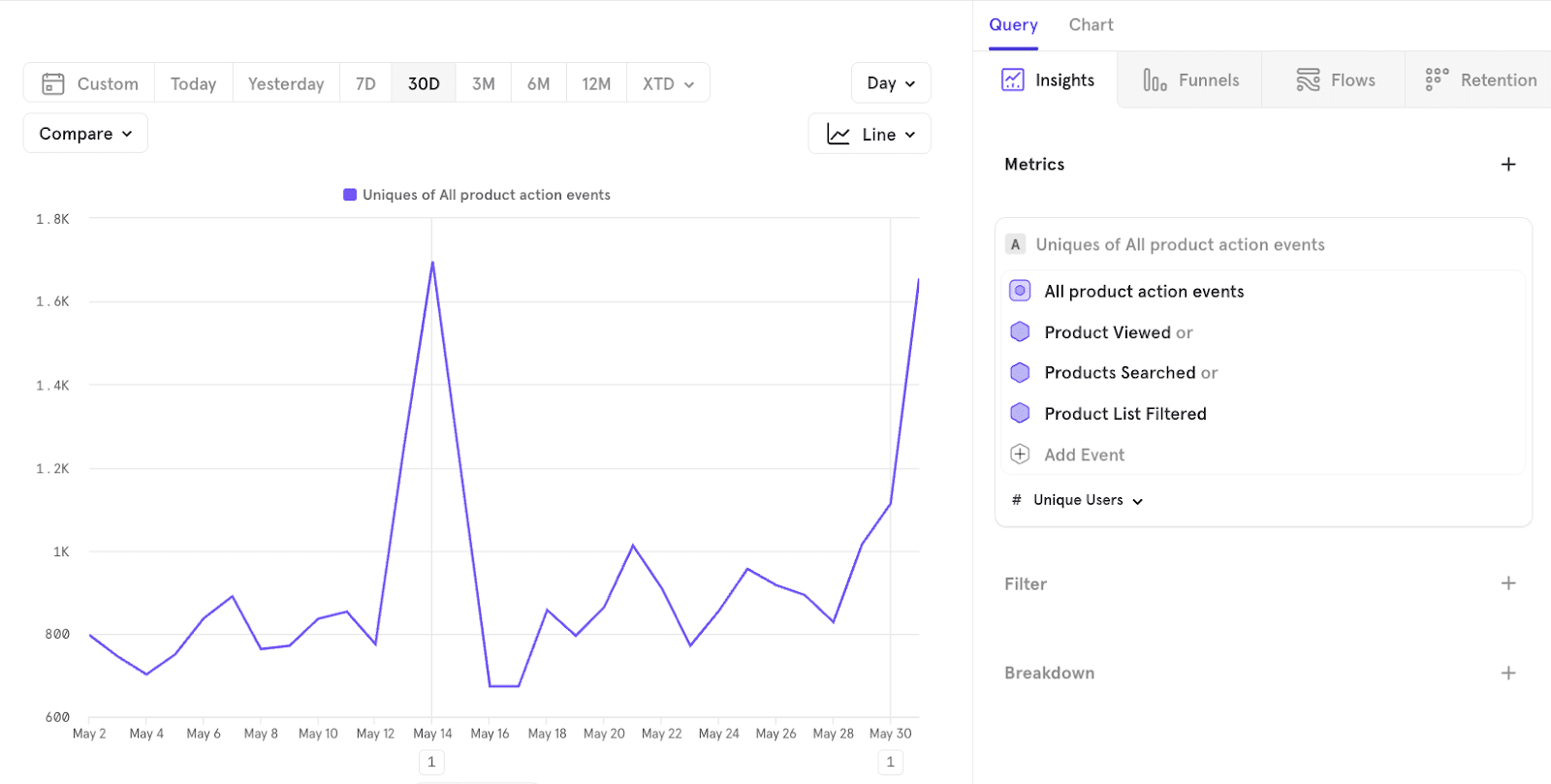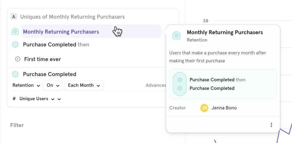 Retention Behaviors look at when a user did an event, then came back to do the same or another event within a window of time. For example, we can save a behavior for our monthly returning purchasers.