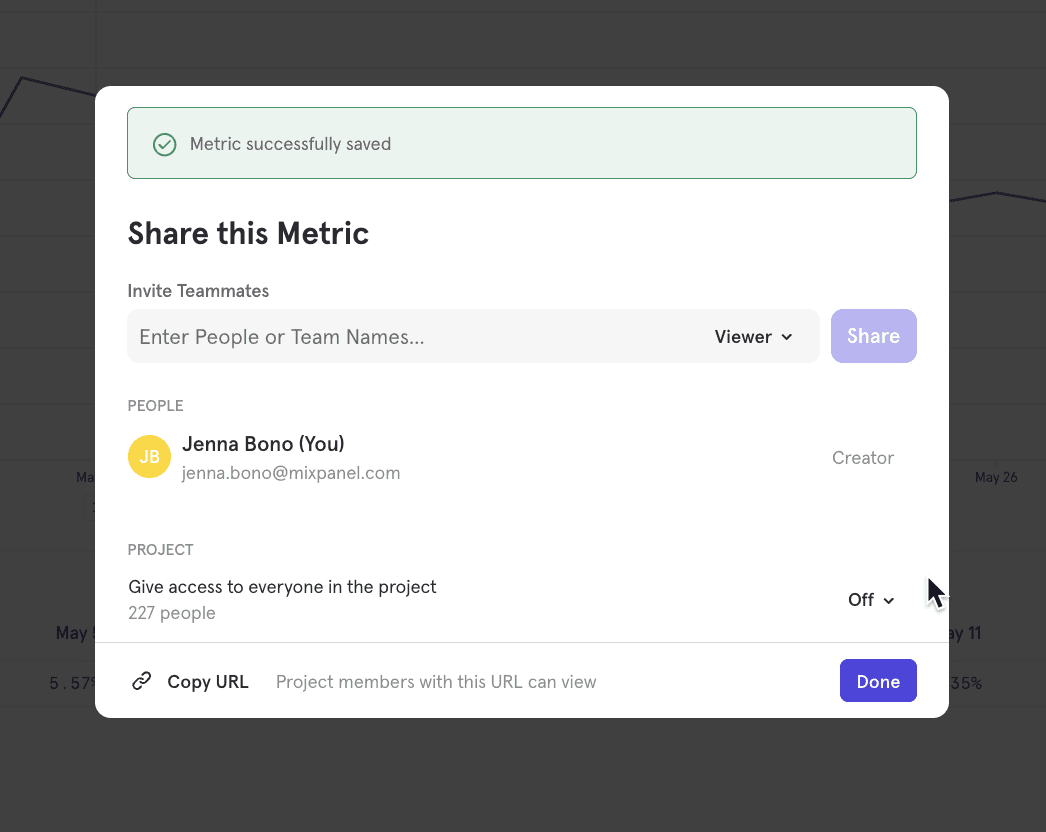 By default, saved metrics and behaviors are private to you. After saving, you will be prompted to share.