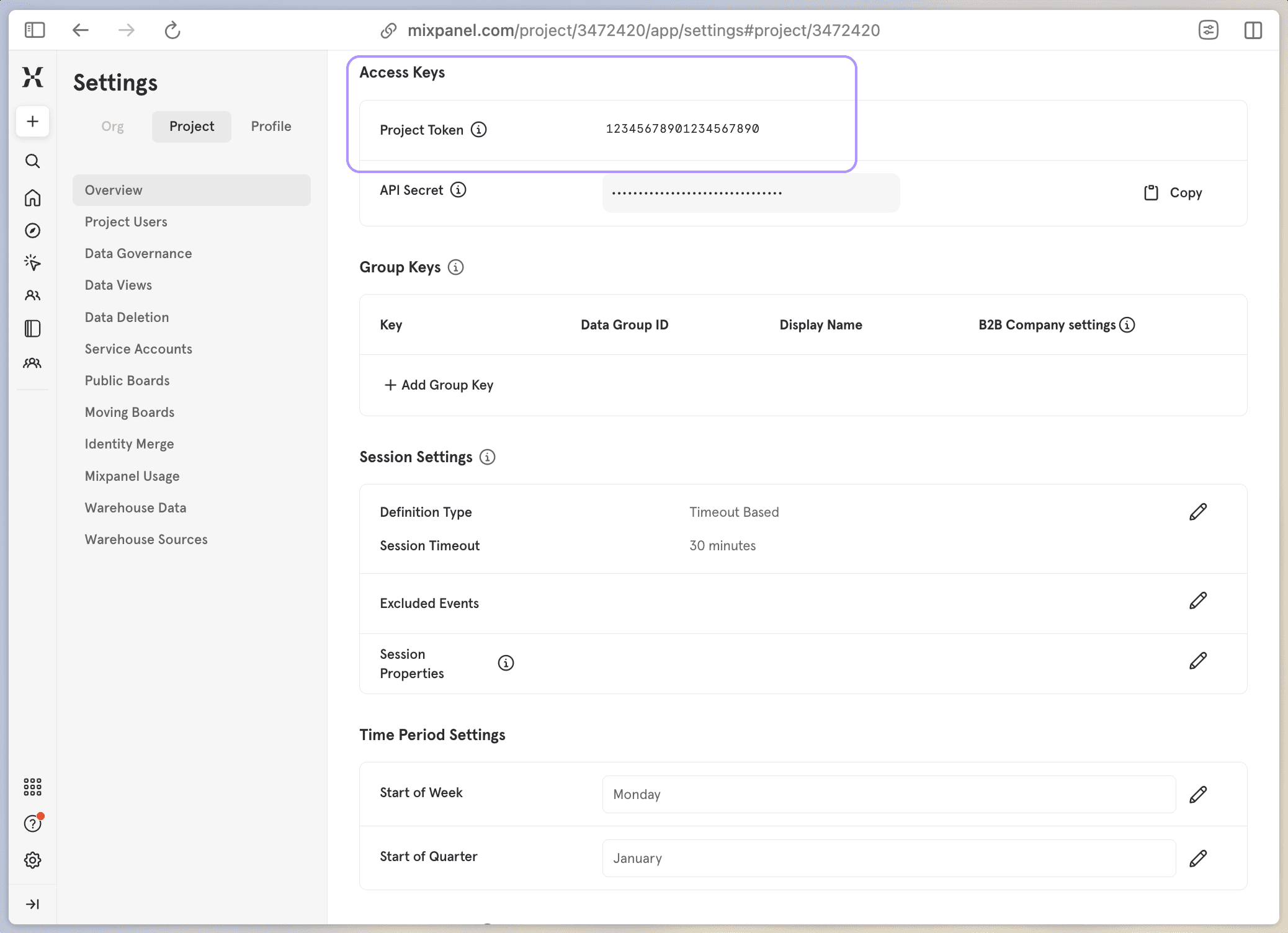 5. Go to your Mixpanel Dashboard > Project Settings and copy your Project Token under Access Keys