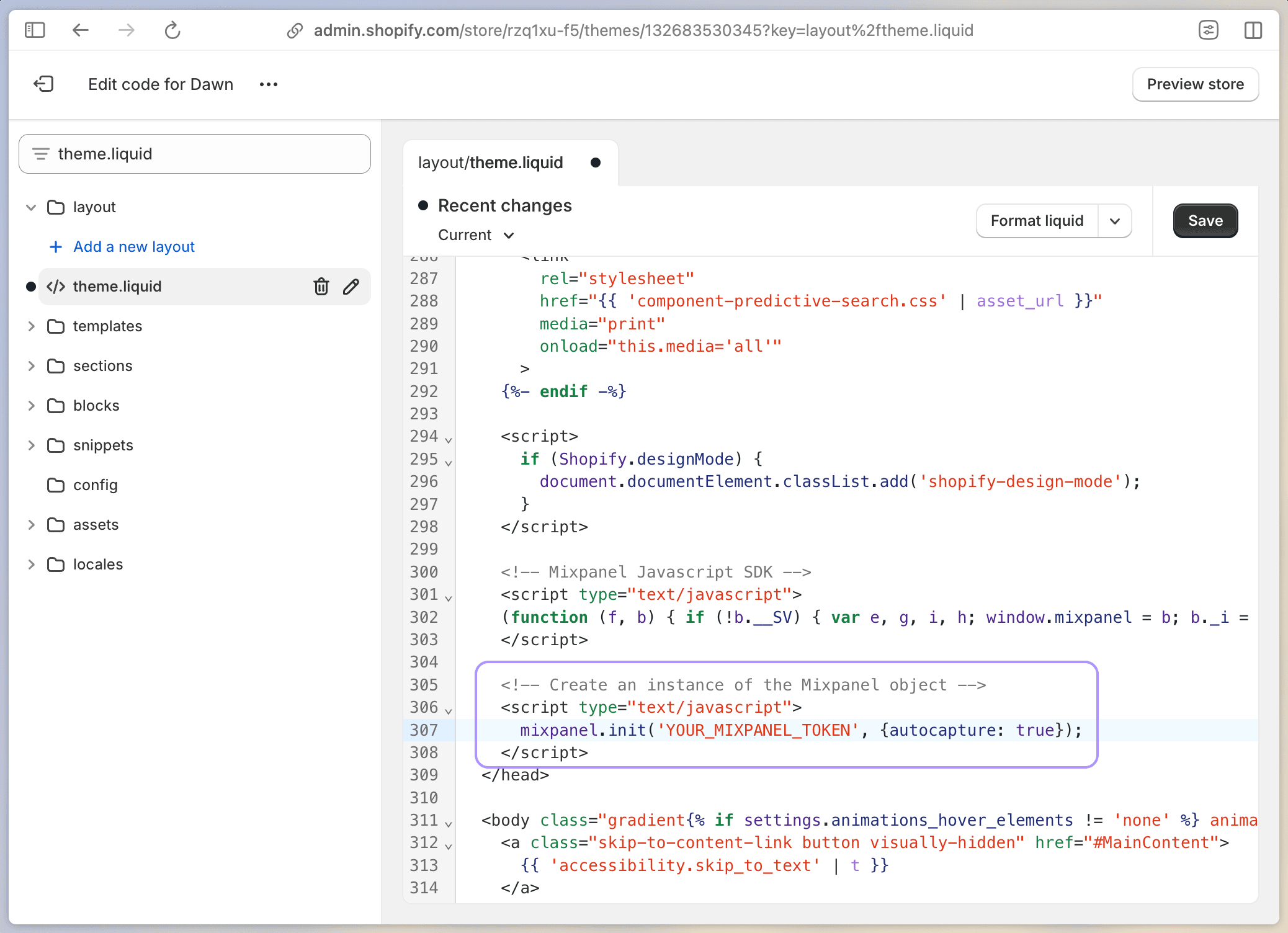 6. Back in your Shopify theme.liquid file, enable Mixpanel’s SDK by adding your Project Token to the mixpanel.init code (wrapped in script tags). Altogether, it should look like this: