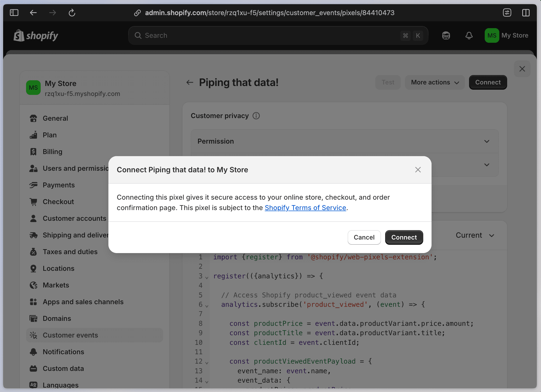 2. Go to your Shopify Store > Settings > Customer Events, click “Add custom Pixel”, and name your Pixel something snazzy